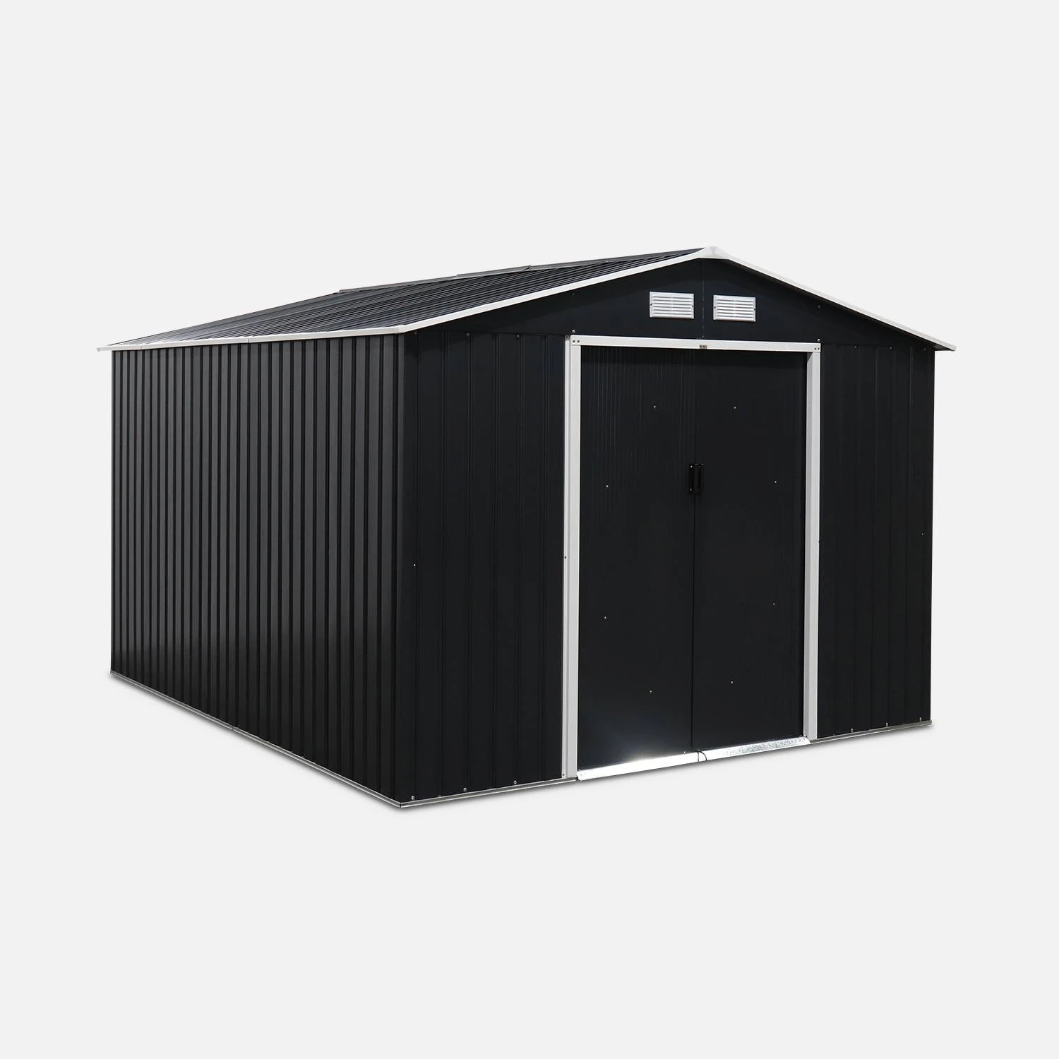 Cette maison de rangement est bien pensée. Elle est dotée d’une double porte coulissante pour ne pas perdre d’espace et faciliter le passage des outils. Les poignées peuvent, d’ailleurs, être liées par un cadenas (non fourni) pour sécuriser. Des grilles d’aération à l’avant et à l’arrière offrent une bonne ventilation et un peu de lumière dans l’abri. Le toit en pente, quant à lui, évite l’accumulation d’eau et de feuilles.