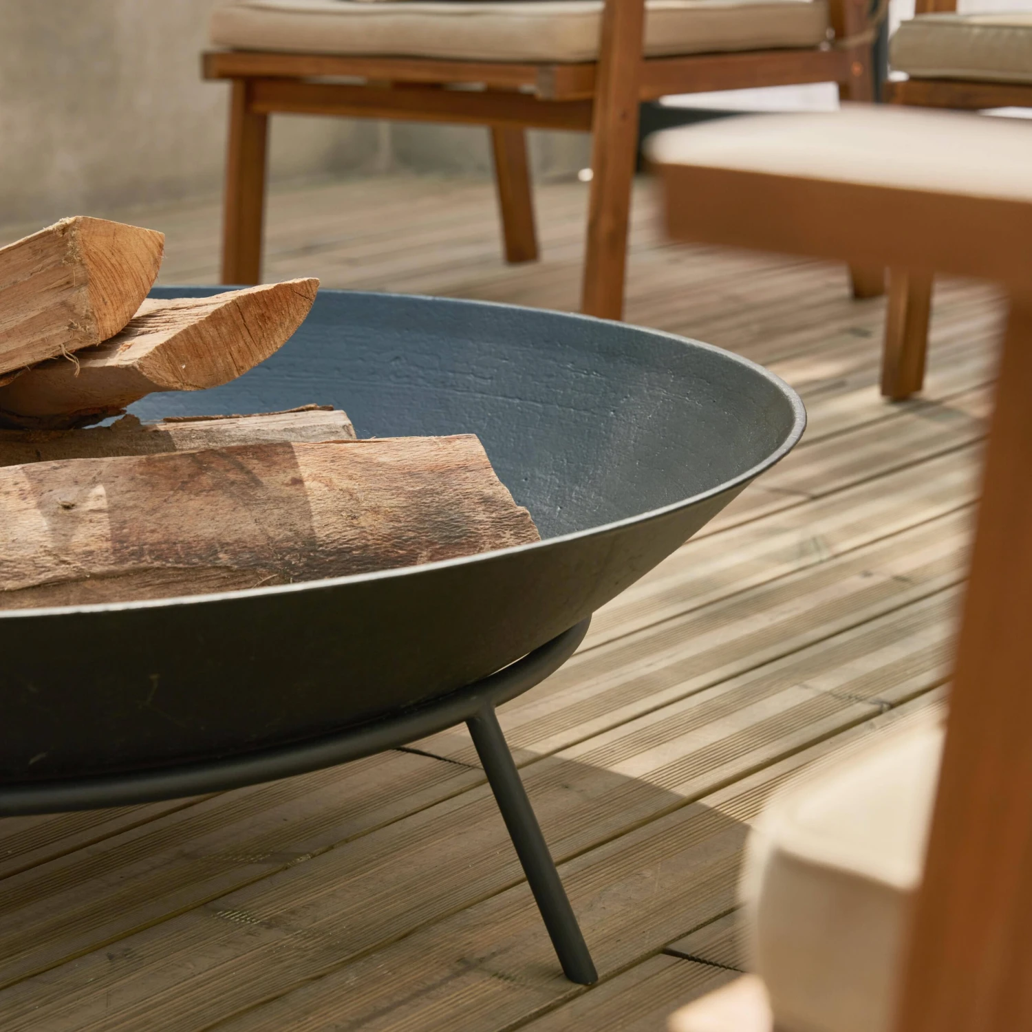 Avec sa forme de bol très large (Ø90cm), il peut contenir un grand volume de bûche. Fabriqué en fonte noire, il a une bonne résistance à la chaleur et est conçu pour durer.Â
