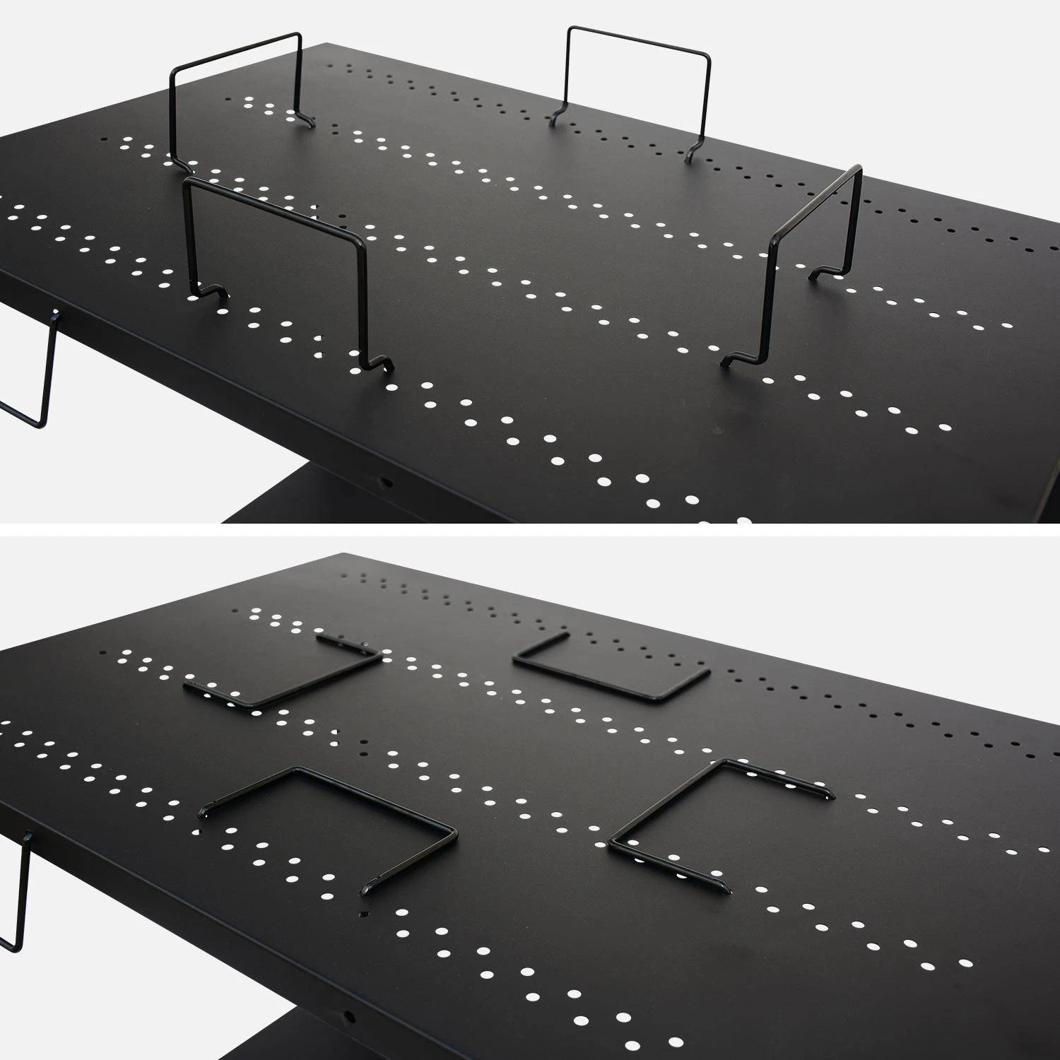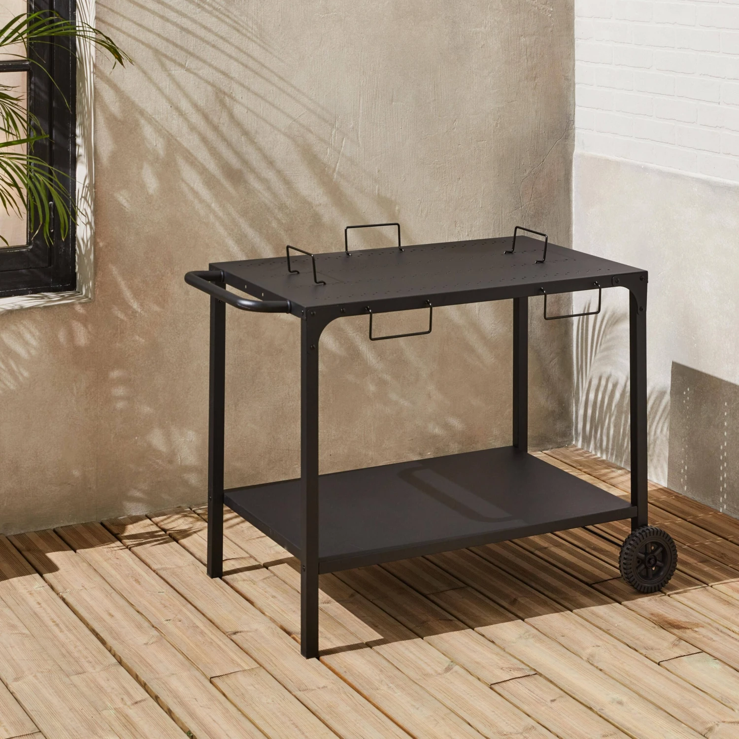 Cette desserte noir en acier est idĂ©ale pour utiliser votre plancha, mais pas que ! 5 crochets mĂ©talliques sont fournis et peuvent ĂŞtre placĂ©s oĂą vous le souhaitez : sur le plateau supĂ©rieur perforĂ© pour caler une plancha ou tout autre accessoire de cuisson, et sur le cĂ´tĂ© pour y accrocher des torchons et ustensiles. Cette desserte s’adapte Ă vos envies et besoins. Vous pouvez d’ailleurs tout autant l’utiliser Ă l’intĂ©rieur qu’Ă l’extĂ©rieur. Grâce Ă sa poignĂ©e et Ă ses deux roues, elle se dĂ©place très facilement pour aller sur votre terrasse ou votre balcon pour vos repas conviviaux ! Sur le plateau infĂ©rieur, vous pouvez ranger vos plats ou la bonbonne de gaz de votre plancha.