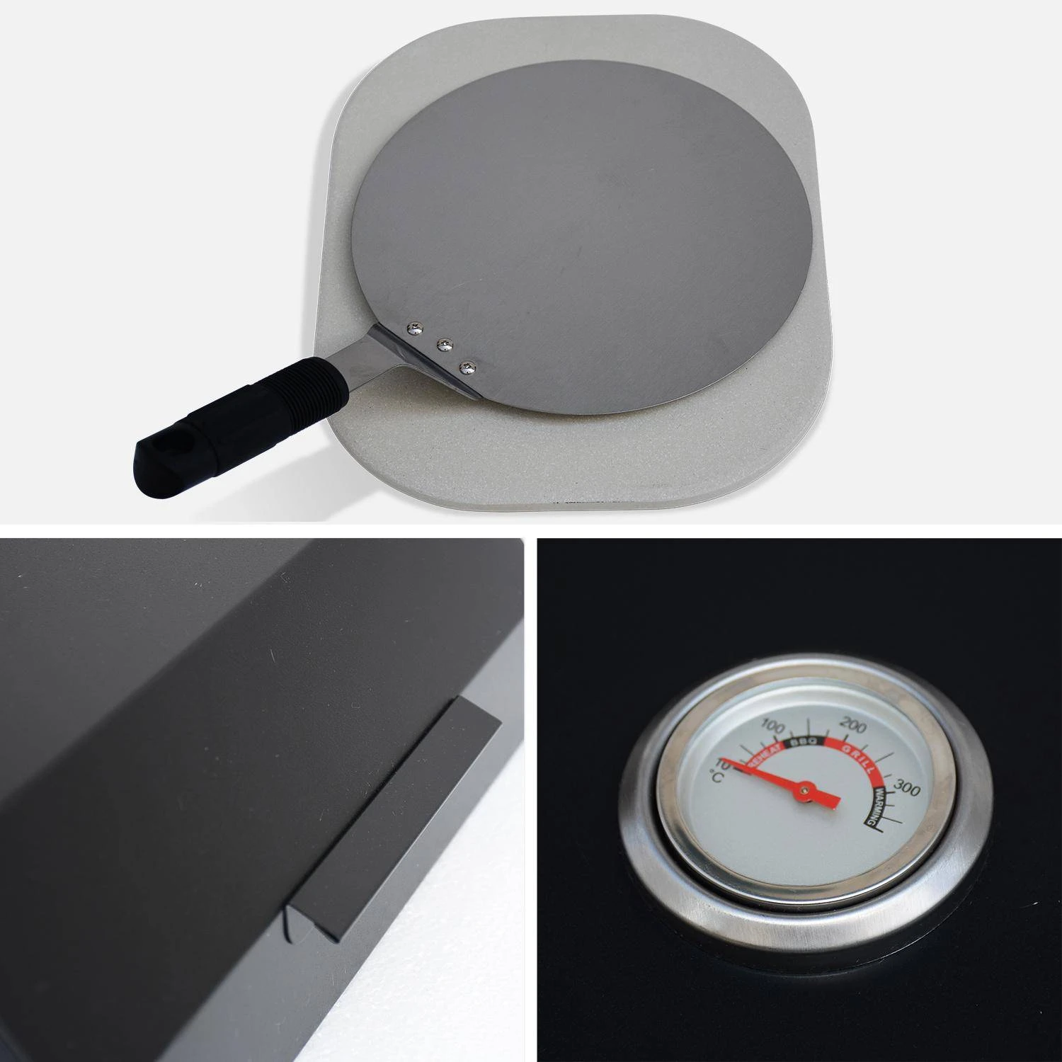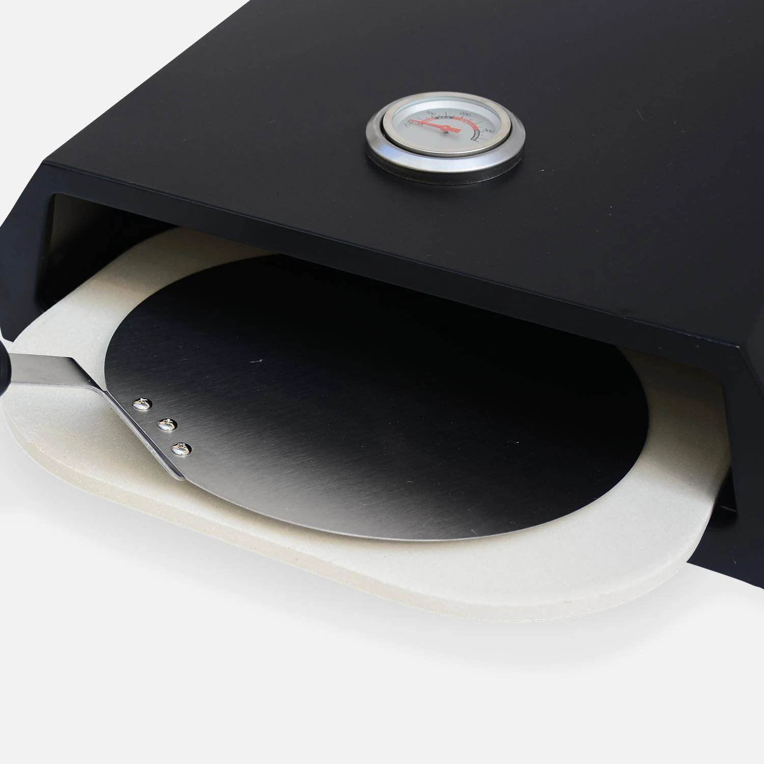 Cet accessoire rectangulaire transforme un barbecue gaz ou charbon en four Ă pizza, mais vous pouvez tout aussi bien y cuir du pain ! Pour ce faire, placez le sur la grille de cuisson de votre barbecue. Pourvu de deux poignĂ©es et portatif, il est très simple d’utilisation. Un thermomètre est intĂ©grĂ© pour vous permettre de surveiller la tempĂ©rature. Le four Ă pizza est livrĂ© avec une pelle Ă manche en bakĂ©lite, matière isolante et rĂ©sistante Ă la chaleur, qui permet de rentrer et sortir les aliments en toute sĂ©curitĂ©. Sa pierre de cuisson de 12mm d’Ă©paisseur est idĂ©ale pour des pizzas de 30cm de diamètre ou moins.