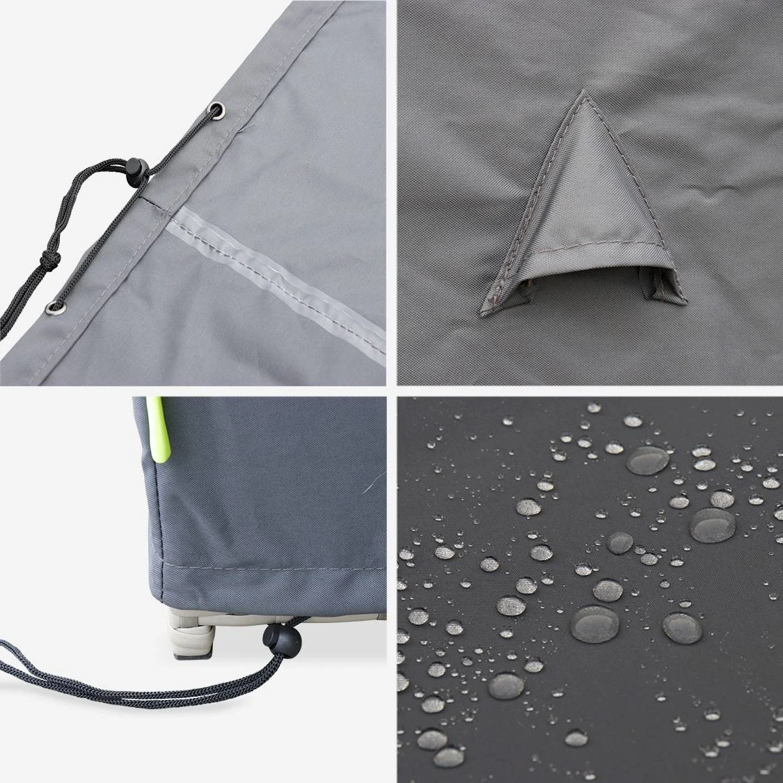 Protégez votre salon de jardin lorsque vous ne l’utilisez pas pour allonger sa durée de vie. Cette housse est en polyester avec un revêtement en polyamide. Déperlante et imperméable grâce à l’enduction PA, elle préserve votre ensemble de jardin de la pluie, de la poussière et du soleil. Cela évite l’usure et les dégradations liées aux intempéries. Pratique, cette housse traitée anti UV est dotée d’un cordon de serrage avec œillets intégrés. Ce cordon est inséré dans l’ourlet et il ressort dans les angles, cela permet de maintenir la housse sur le salon de jardin. Quatre aérateurs placés sur la housse empêchent la condensation. L’air libre circule également par le bas. Ainsi, les risques de moisissures sont évités.
