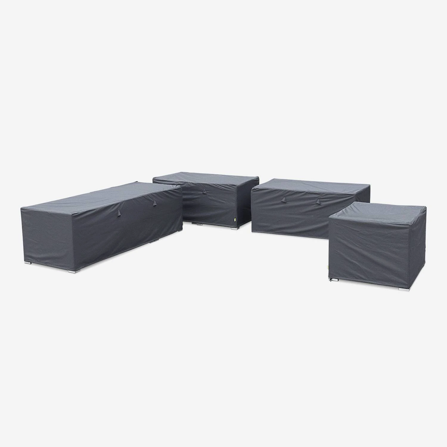 Protégez votre salon de jardin lorsque vous ne l’utilisez pas pour allonger sa durée de vie. Ces quatre housses sont en polyester avec un revêtement en polyamide. Déperlantes et imperméables grâce à l’enduction PA, elles préservent votre ensemble de jardin de la pluie, de la poussière et du soleil. Cela évite l’usure et les dégradations liées aux intempéries. Pratiques, ces housses traitées anti UV sont dotées d’un cordon de serrage avec œillets intégrés. Ce cordon est inséré dans l’ourlet et il ressort dans les angles, cela permet de maintenir les housses sur le salon de jardin. Deux aérateurs placés sur chaque housse empêchent la condensation. L’air libre circule également par le bas. Ainsi, les risques de moisissures sont évités.