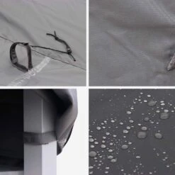 Protégez votre salon de jardin lorsque vous ne l’utilisez pas pour allonger sa durée de vie. Cette housse est en polyester avec un revêtement en polyamide. Déperlante et imperméable grâce à l’enduction PA, elle préserve votre ensemble de jardin de la pluie, de la poussière et du soleil. Cela évite l’usure et les dégradations liées aux intempéries. Pratique, cette housse traitée anti UV est dotée d’un cordon de serrage avec œillets intégrés. Ce cordon est inséré dans l’ourlet et il ressort dans les angles, cela permet de maintenir la housse sur le salon de jardin. Quatre aérateurs placés sur la housse empêchent la condensation. L’air libre circule également par le bas. Ainsi, les risques de moisissures sont évités.