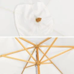 La structure du parasol Cabourg est en bois. La toile est en polyester enduit d’un produit hydrofuge qui la rend déperlante. Le mât s’insère dans n’importe quel pied de parasol compatible avec les mâts de 38mm de diamètre.