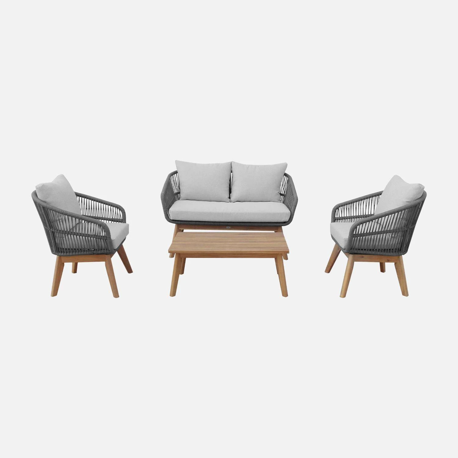 ComposĂ© d’un canapĂ©, de deux fauteuils et d’une table basse, le salon de jardin Rosario accueille confortablement 4 personnes. FabriquĂ© Ă partir de corde et de bois dans des tons naturels, il a un style rĂ©solument scandinave et est conçu avec des matĂ©riaux qui se combinent parfaitement. Ses pieds obliques lui donnent en plus un petit cĂ´tĂ© rĂ©tro. ElĂ©gant, ce salon de jardin trouve sa place Ă l’intĂ©rieur comme Ă l’extĂ©rieur.