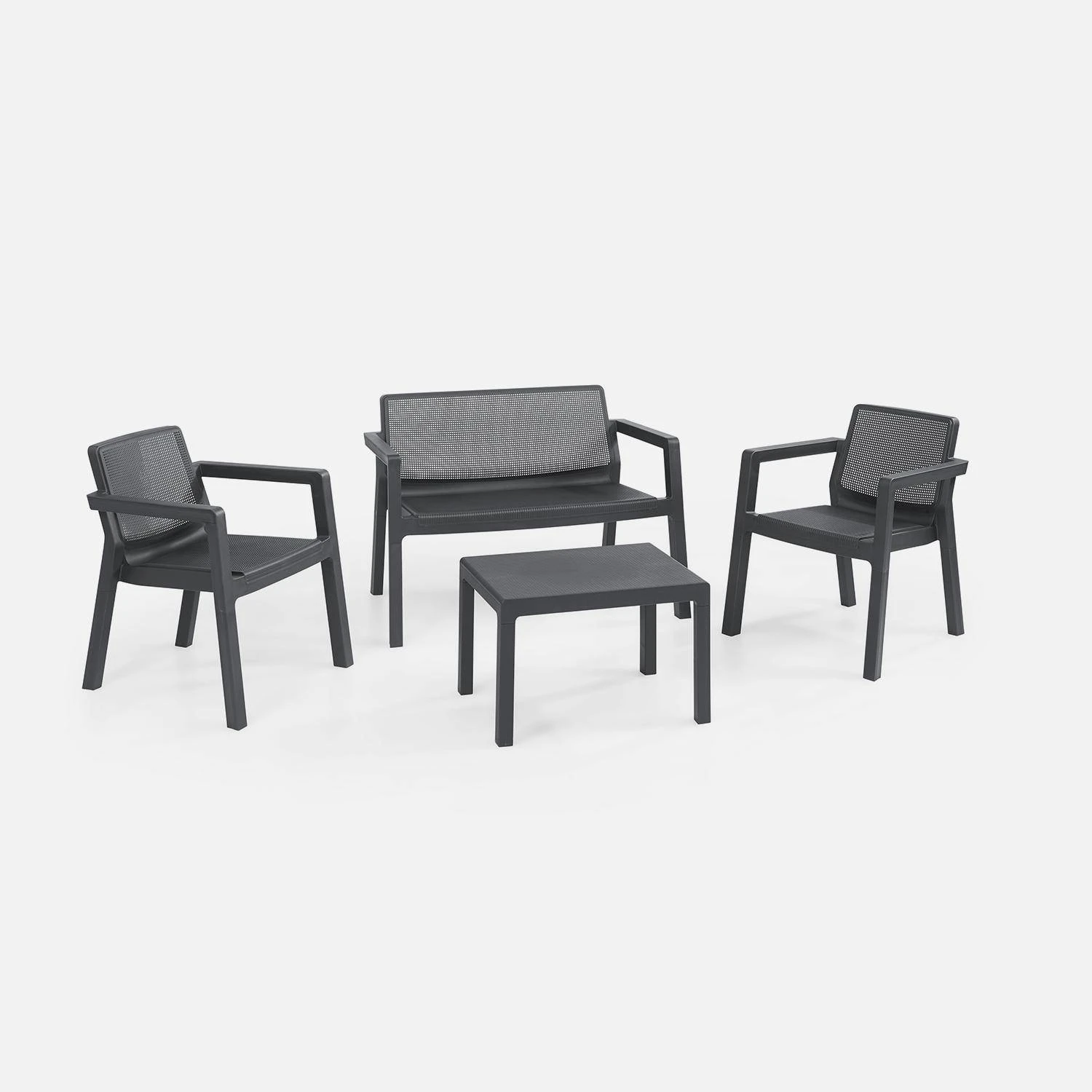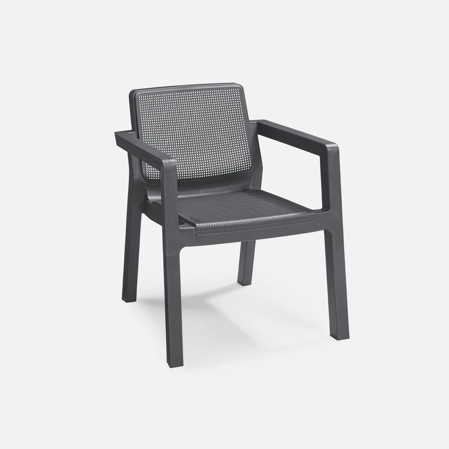Les assises de ce salon permettront d’accueillir 4 convives, idéal pour un apéro entre amis. Aucune matière sensible, il sera donc très facile de l’entretenir. Sa couleur graphite est tendance et s’accomodera à tous les styles. Enfin, afin de gagner de la place, les fauteuils sont empilables.