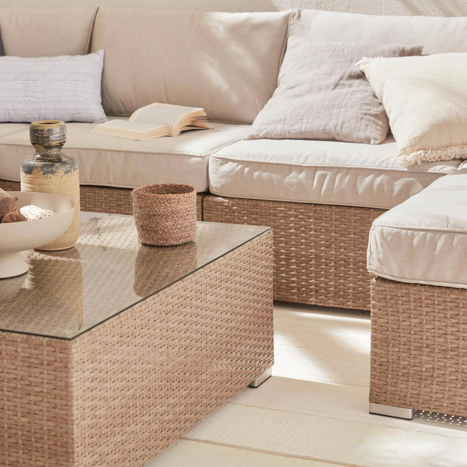 sweeek sélectionne avec attention la qualité de la matière choisie pour le tressage. De ce fait, la durée de vie du Venezia est exceptionnelle ! La résine tressée sweeek supporte les rayons du soleil et les intempéries (neige/ pluie / eaux salées). Les coussins sont déhoussables et résistants à l’eau. Pour garantir une résistance maximale, la structure du salon de jardin est en aluminium renforcé (ne rouille pas par nature). Les structures en aluminium sont, en plus, bien plus légères que les structures en acier. Le plateau en verre de la table basse est en verre trempé de 5mm d’épaisseur. C’est un verre 5 fois plus résistant que le verre traditionnel ! Le Venezia est livré avec un lot de 12 connecteurs pour fixer les différents modules ensemble.