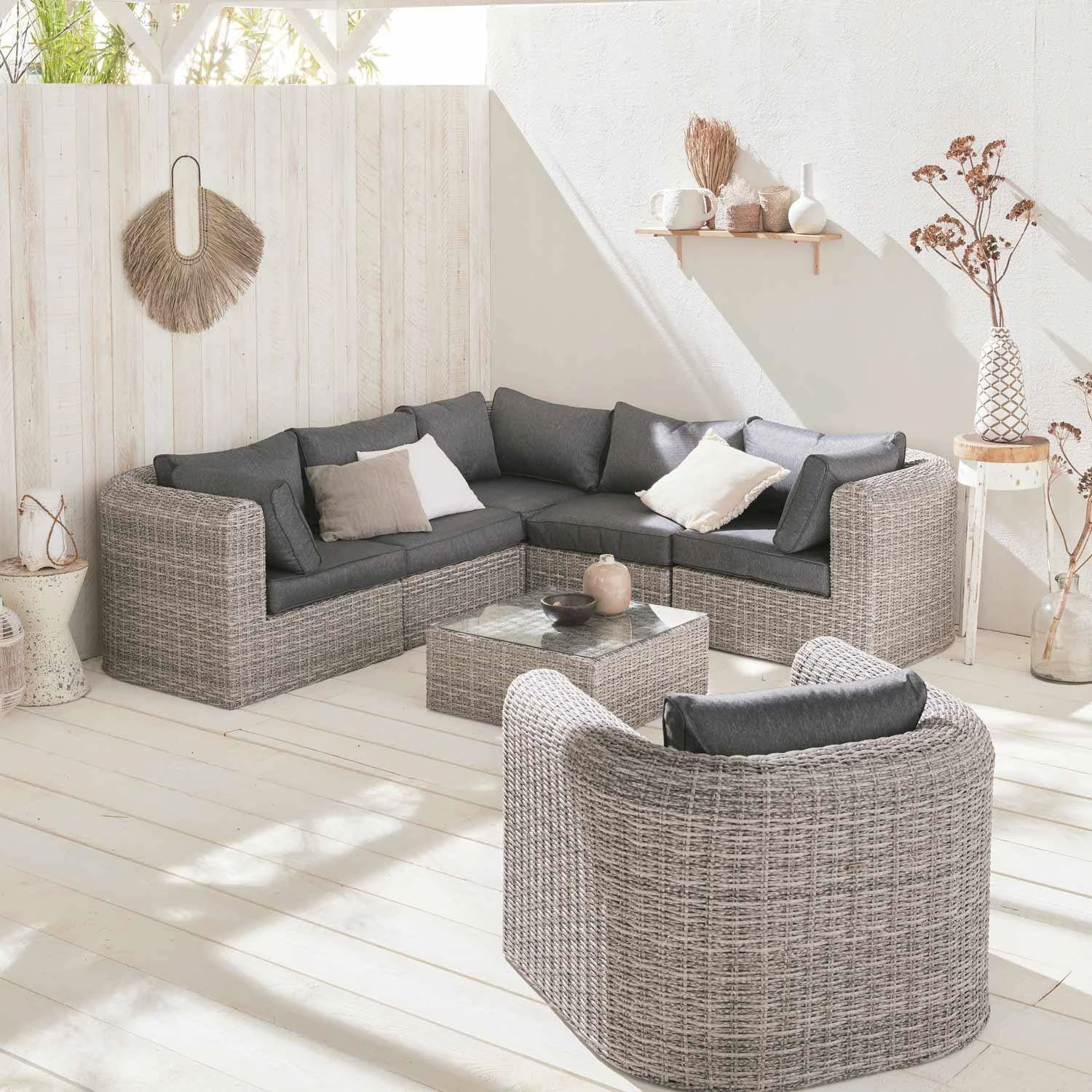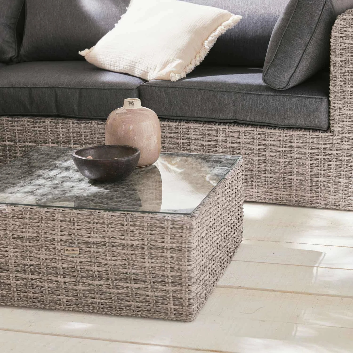 sweeek sélectionne avec attention la qualité de la matière choisie pour le tressage. De ce fait, la durée de vie du Tonico est exceptionnelle ! La résine tressée arrondie sweeek supporte les rayons du soleil et les intempéries (neige/ pluie / eaux salées). Les coussins sont déhoussables et résistants à l’eau. Pour garantir une résistance maximale, la structure du salon de jardin est en aluminium renforcé (ne rouille pas par nature). Les structures en aluminium sont, en plus, bien plus légères que les structures en acier. Le plateau en verre de la table basse est en verre sécurit de 5mm d’épaisseur. C’est un verre 5 fois plus résistant que le verre traditionnel.