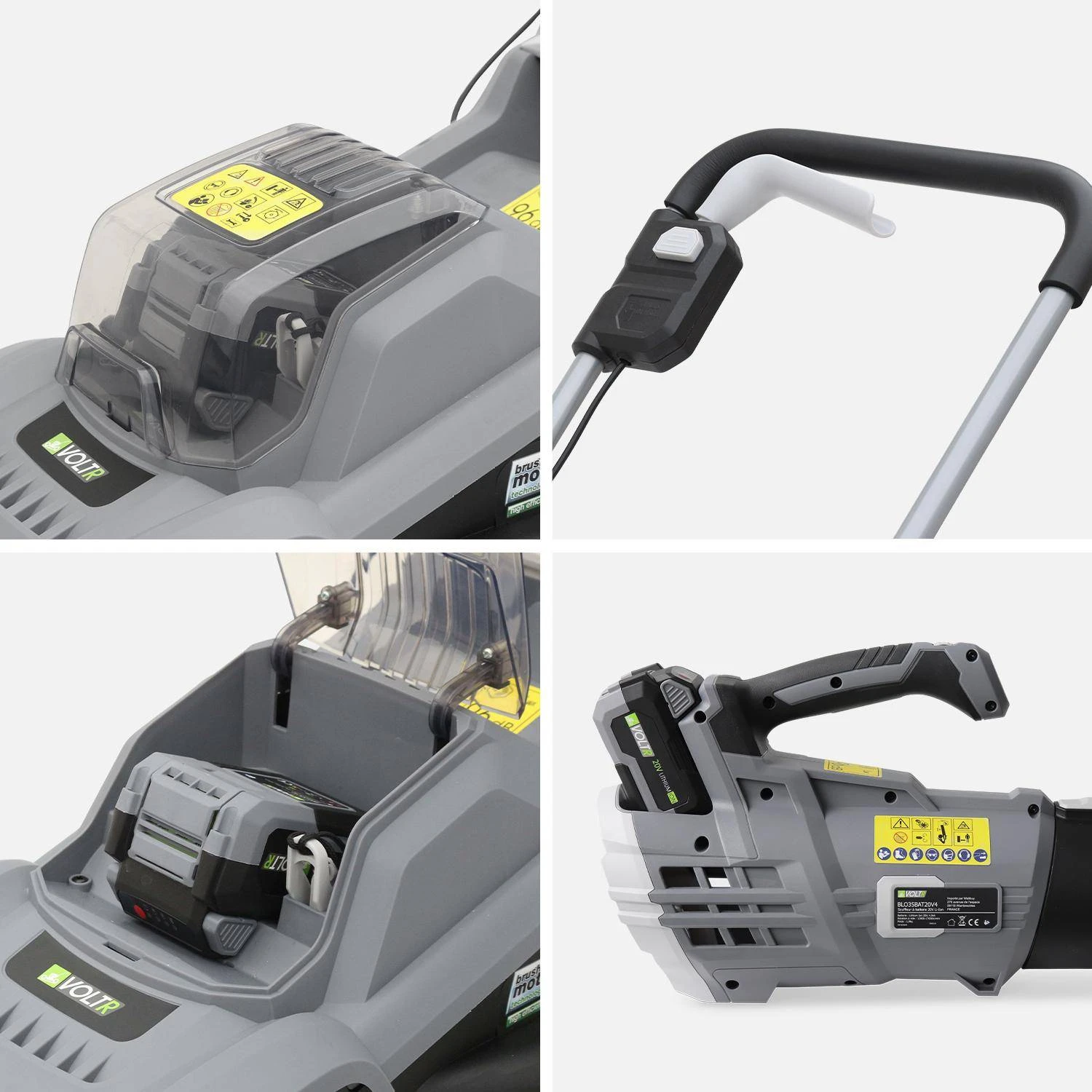 La tondeuse a un moteur de type « brushless » sans balais, pour moins de frottement et donc moins d’usure. Ces outils ont une batterie fabriquée à partir de composants Lithium-Ion. C’est un gage de longévité et de qualité. En effet, les batteries Li-Ion apportent une puissance immédiate et continue, sans faiblir. Lorsque la batterie est déchargée, l’outil s’arrêtera directement, sans signes de faiblesse au préalable. Alors, l’accumulateur est équipé d’un témoin LED qui permet de connaitre le niveau de charge de la batterie, à tout moment. Autre avantage de ce type de batteries, elles peuvent se recharger n’importe quand car il n’est pas utile d’attendre qu’elles soient vidées entièrement. La batterie est compatible avec d’autres appareils 20V de la marque VOLTR. Avant la première utilisation, il faudra recharger complètement, une première fois, la batterie.