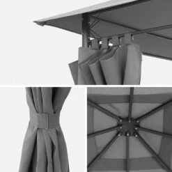 Divio est une très jolie tonnelle adéquate pour vos brunchs et apéritifs dans le jardin. Très esthétique, elle est également très pratique car elle peut se fermer complètement, si besoin, grâce aux rideaux fournis. Les rideaux se ferment grâce à une fermeture éclair. Lorsqu’ils sont ouverts, ils se fixent aux pieds de la pergola à l’aide d’une bande velcro.Â
