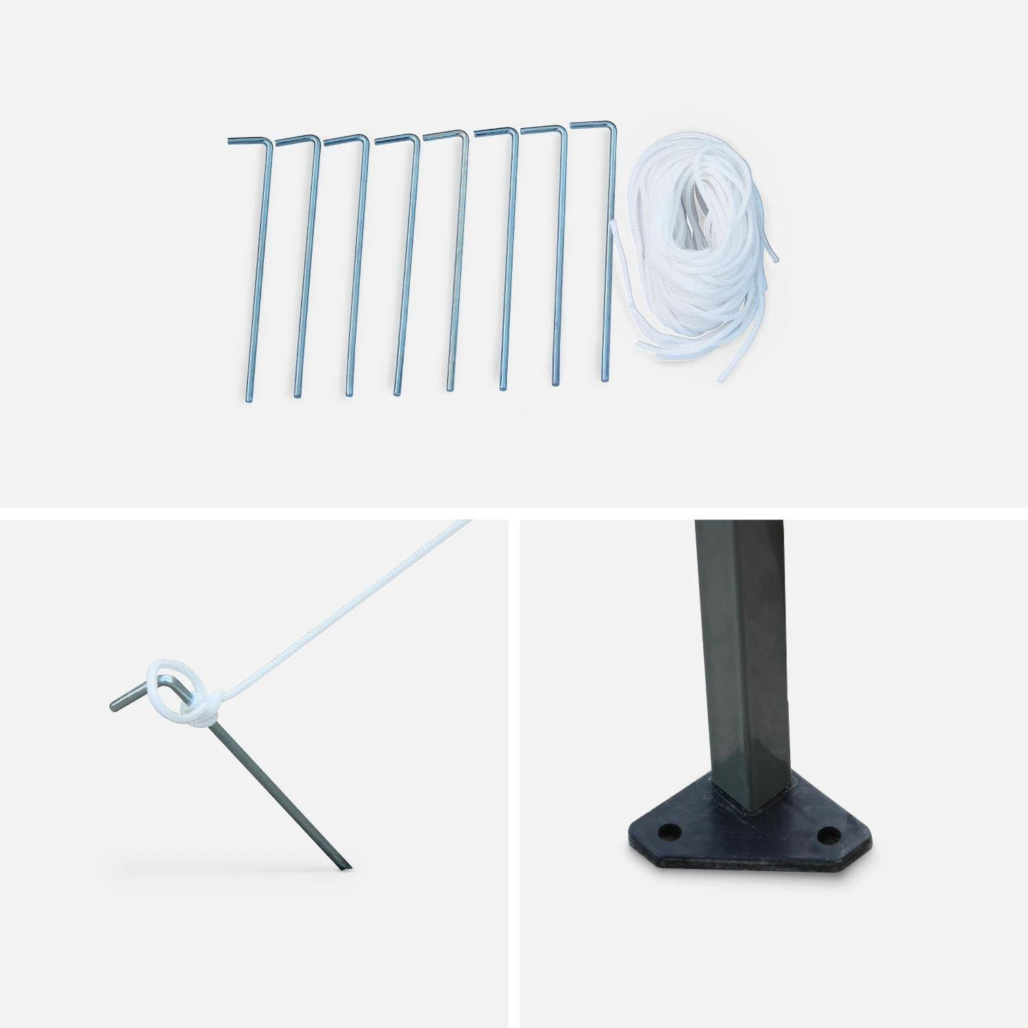 Cordes, sardines, et pieds pré-percés en plastique sont livrés avec la pergola pour la fixer au sol et assurer une bonne stabilité. Elle se range facilement dans son sac de transport fourni.